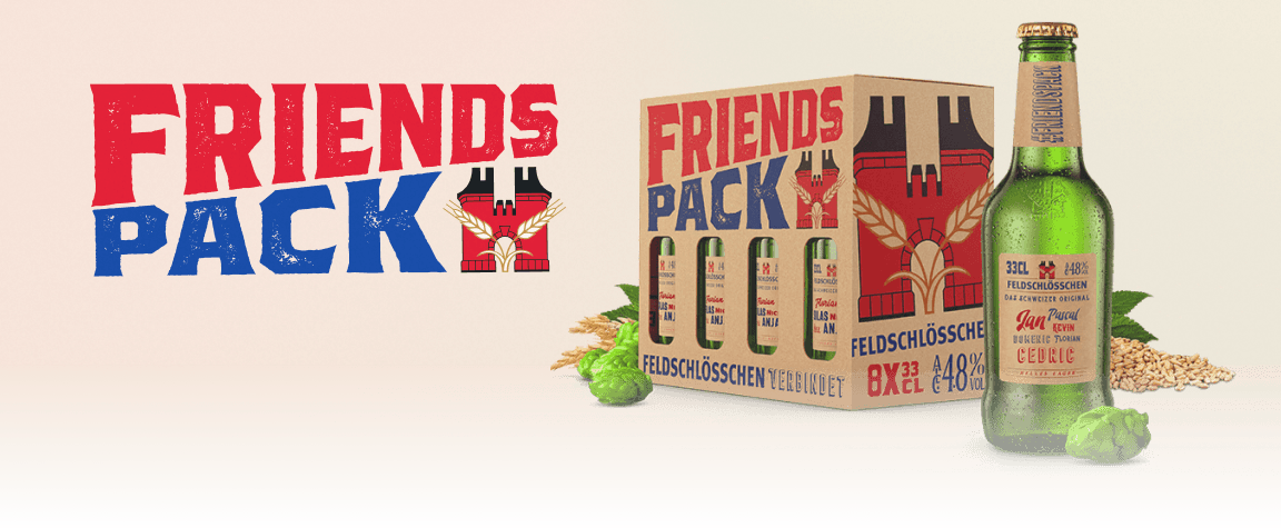 Mit Friendspack haben wir für Feldschlösschen eine Personalisierungskampagne umgesetzt: ein individuelles 6-Pack Bier mit Namen, Logo oder Bild – innerhalb einer Woche ausverkauft.
