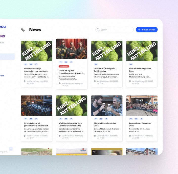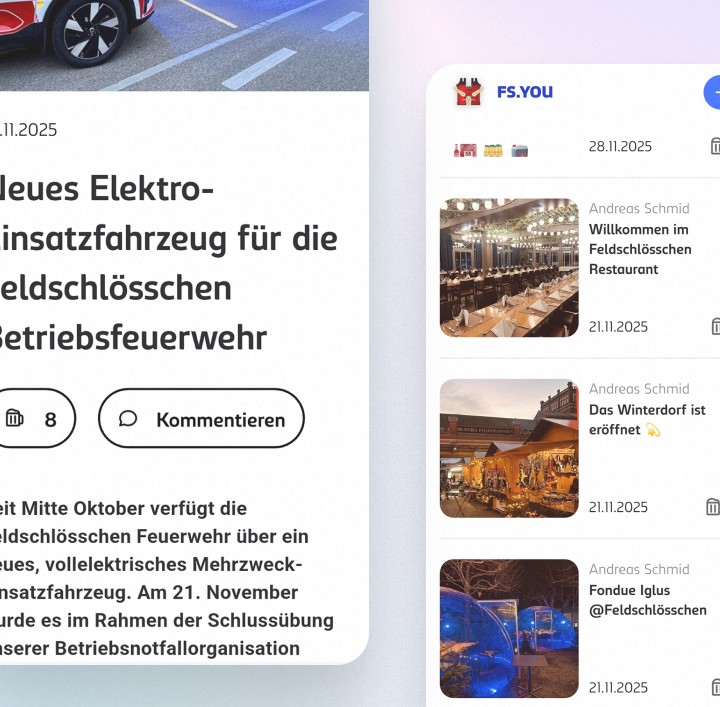 Die Feldschlösschen Mitarbeiter-App ist der zentrale digitale Kommunikationskanal des Unternehmens. Sie bringt Unternehmensnews, interne Updates, Dokumente und Interaktionen direkt aufs Smartphone – für alle Mitarbeitenden, inklusive Pensionären. Die Lösung ersetzt verstreute Kommunikationskanäle und schafft einen modernen, mobilen Zugang zu relevanten Informationen.