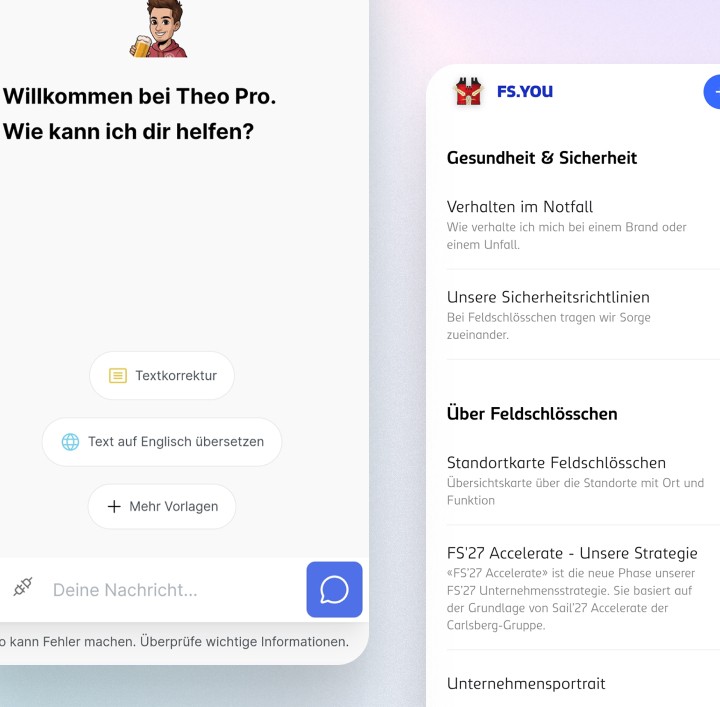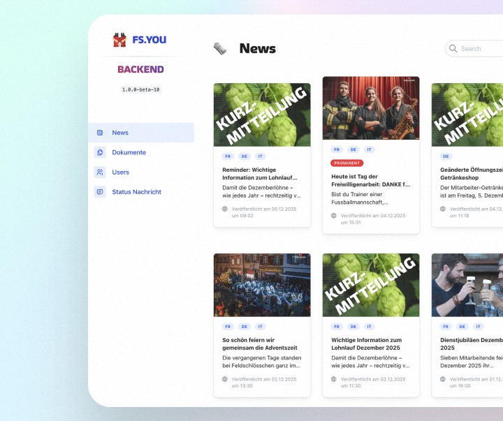 Seit 2020 wird die App kontinuierlich weiterentwickelt. Sie bietet Push-Benachrichtigungen, multimediale Inhalte, Kommentarfunktionen und einen integrierten KI-Chatbot für schnelle Antworten rund um Feldschlösschen. Durch die klare UX, den einfachen Zugang (inkl. Magic Links) und ein leistungsfähiges Admin-Backend hat sich die Mitarbeiter-App als zentraler Kommunikationskanal im Unternehmen etabliert.