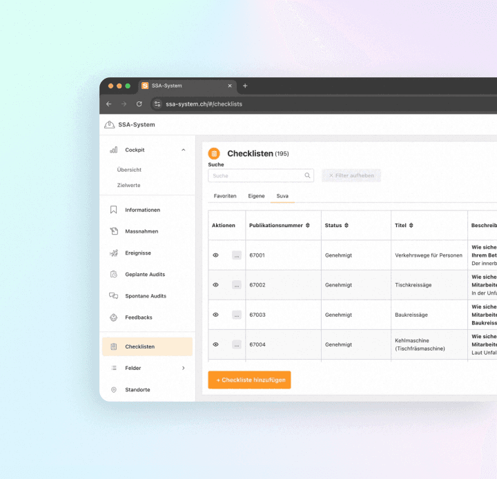 SSA-System ist die digitale Komplettlösung für Arbeitssicherheit und Gesundheitsschutz für Unternehmen in der Schweiz. Mit zentraler Steuerung aller Sicherheitsaufgaben, tagesaktuellen SUVA-Checklisten Massnahmenmanagement und rechtssicherer Dokumentation unterstützt das System Organisationen dabei, Berufsunfälle zu reduzieren und gesetzliche Vorgaben, wie EKAS 6508 und den ASA-10-Punkte-Plan, einzuhalten.