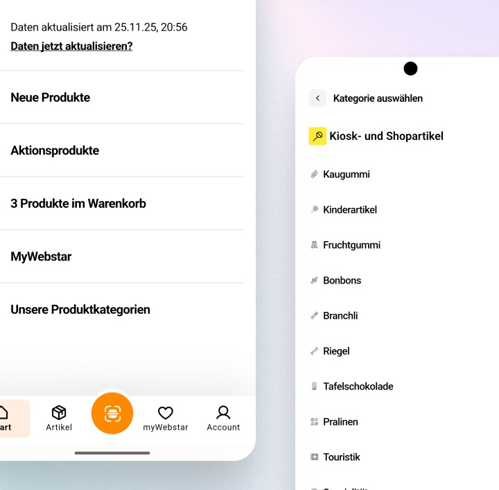 Mit Scan & Order hat Webstar seine bestehende Scanner-Lösung vollständig modernisiert und durch eine neue, intuitive Android-App ersetzt. Die App kombiniert schnelles Barcode-Scanning mit einem vollständigen B2B-Shop – inklusive Kategorien, Suche, Favoriten und Produktdetails.