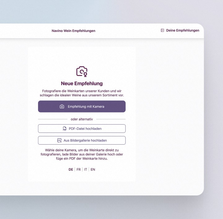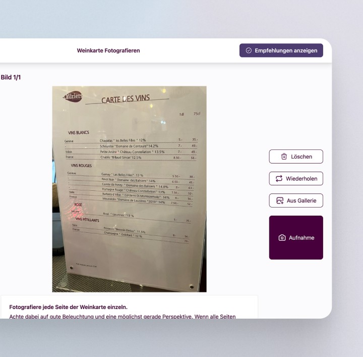KI-gestützte Beratung für Gastronomiekarten. Direkt im Aussendienst. Von der fotografierten Weinkarte zur passenden Empfehlung – in wenigen Sekunden.